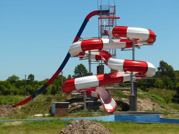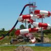 Estrutura de grande porte com dois toboáguas. Um toboágua de queda grande e reta. Outro toboágua tubular giratório com seis curvas.